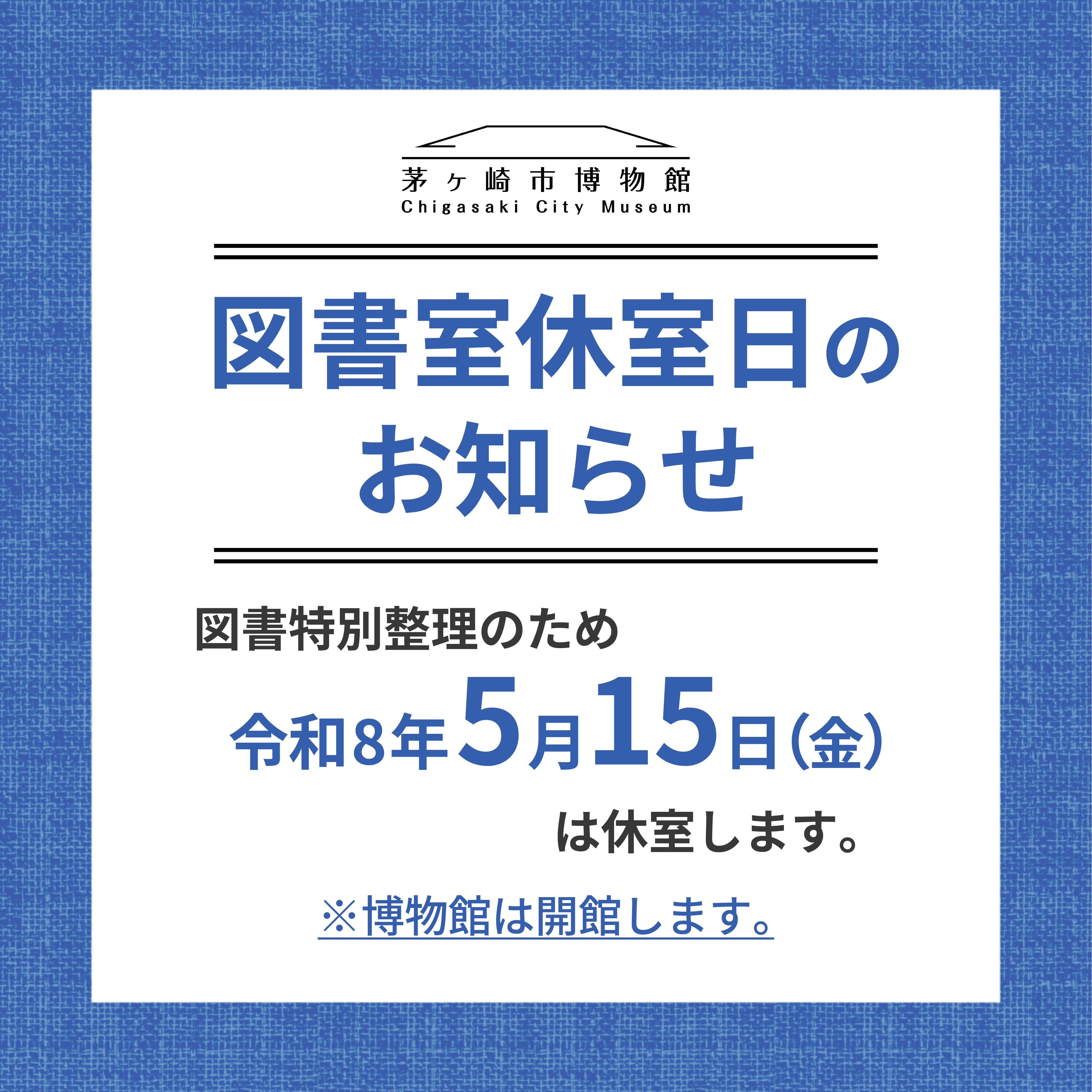 図書特別整理に伴い、令和8年5月15日(金)は休室いたします。