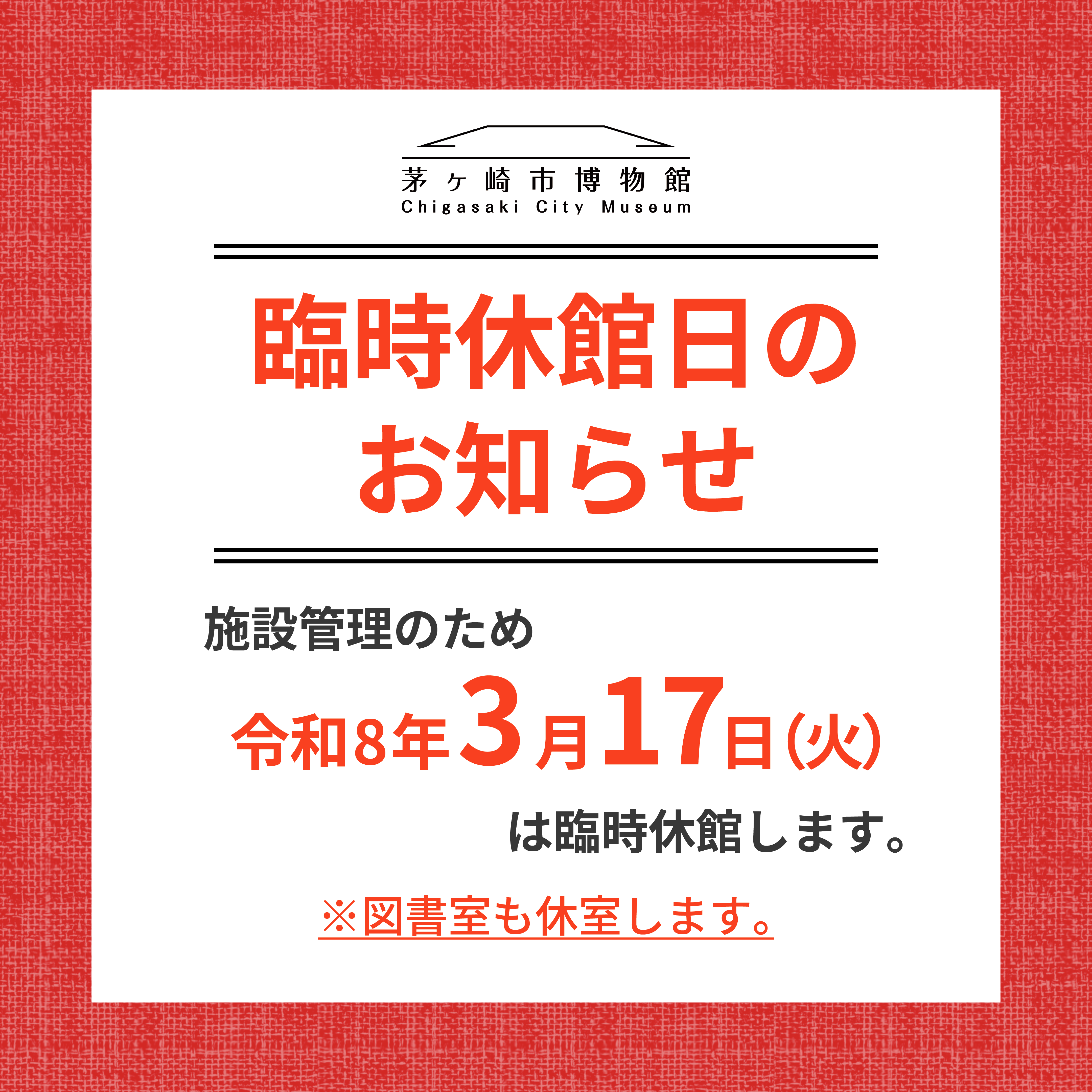 【重要】臨時休館日のお知らせ《令和8年3月17日(火)》